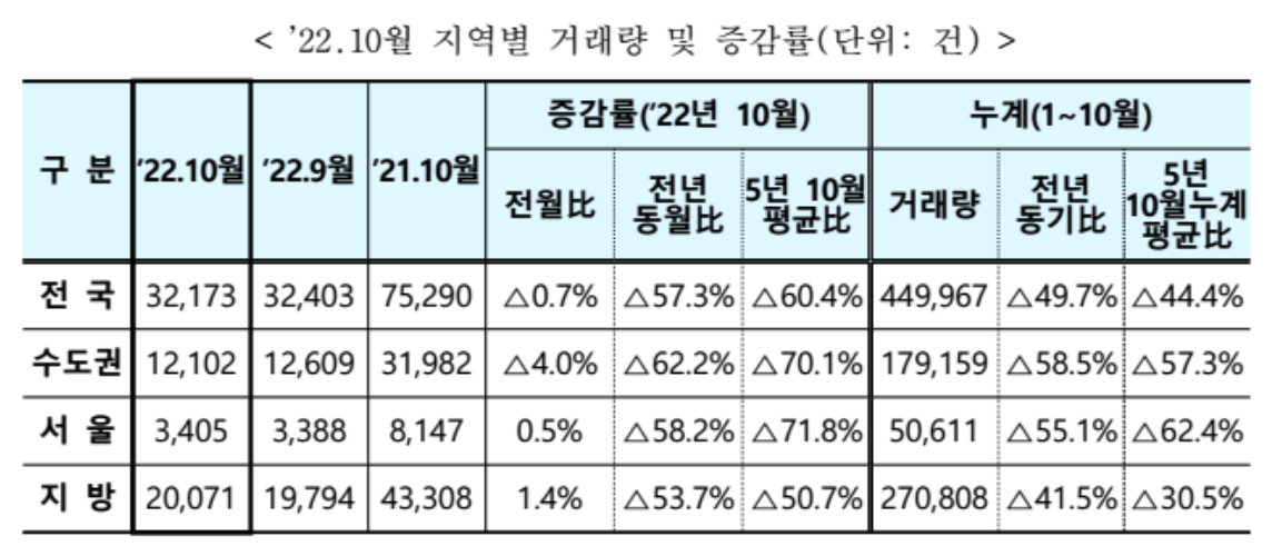 '22년 10월 기준, 주택 매매 거래량(신고일 기준)은 총 32,173건으로 10월 한달 및 누계 기준은 아래와 같습니다
